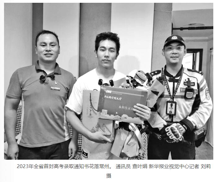 晨报讯(通讯员 陈帅 南京晨报/爱南京记者 陈起增)2023年全省首封高考录取通知书花落常州!7月10日,中国邮政常州市分公司天宁揽投部投递员、“常州市五一劳动奖章”获得者徐大磊手捧鲜花将中国科学院大学的录取通知书送达考生朱子佳手中,并向他表示祝贺。常州交警为今年的首封高考通知书投递开道护航,整个投递过程仅用20分钟。