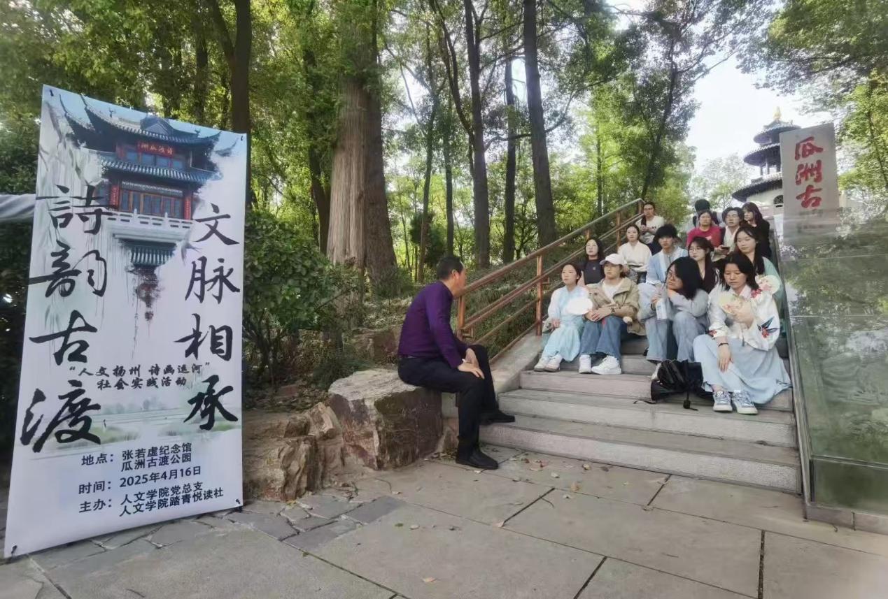 为传承古典文化,厚植青年学子的人文素养,4 月 16 日下午,扬州市职业大学踏青悦读社组织 20 余名师生前往张若虚纪念馆与瓜洲古渡公园,开展了一场别开生面的“诗韵古渡,文脉传承”主题实践活动。本期活动通过诗词朗诵、非遗拓印、实景品读等形式,将文学经典与自然风物相融合,携同学们踏上诗意盎然的春日文化之旅。