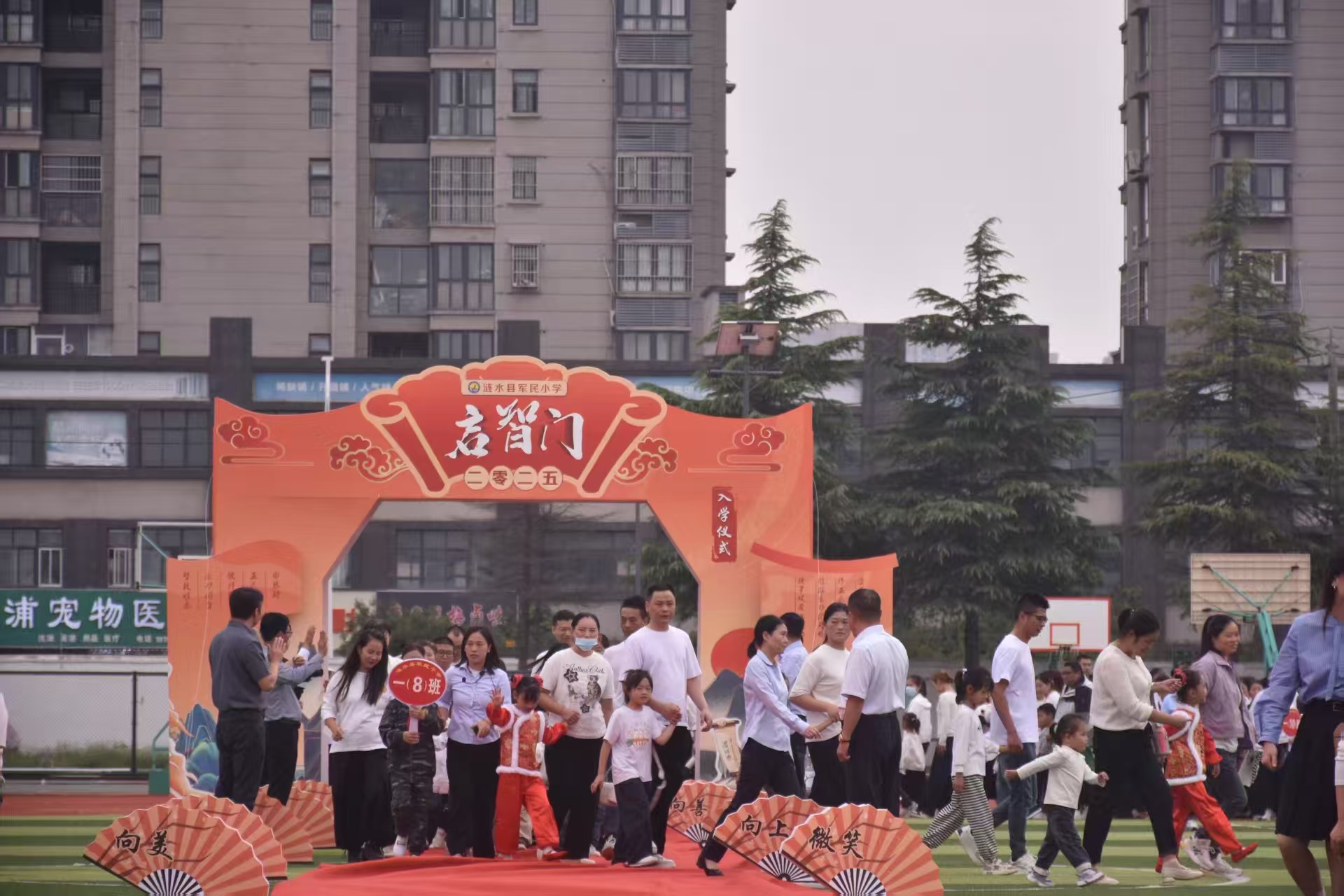 活动伊始,一年级的新同学在班主任的带领下,牵着家长的手满载梦想与期待,穿过了象征着希望与智慧的“启智门”,他们灿烂的笑容里荡漾着幸福。校领导在红毯两侧挥手欢迎每一位新同学的到来,给孩子们带来温暖和关爱。