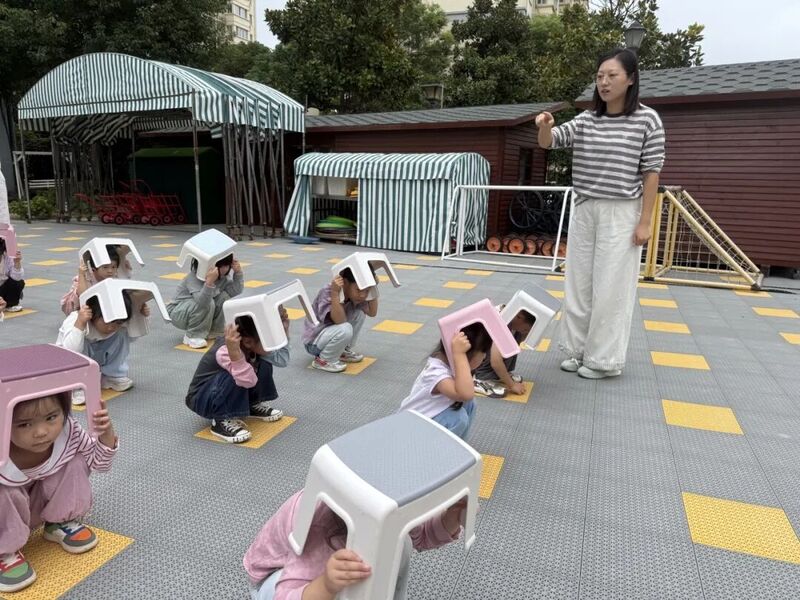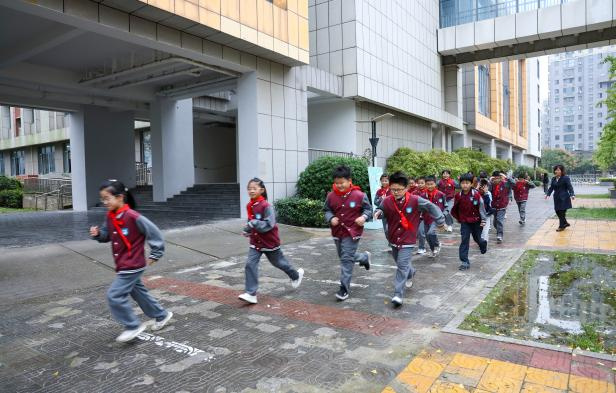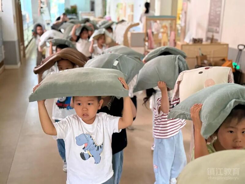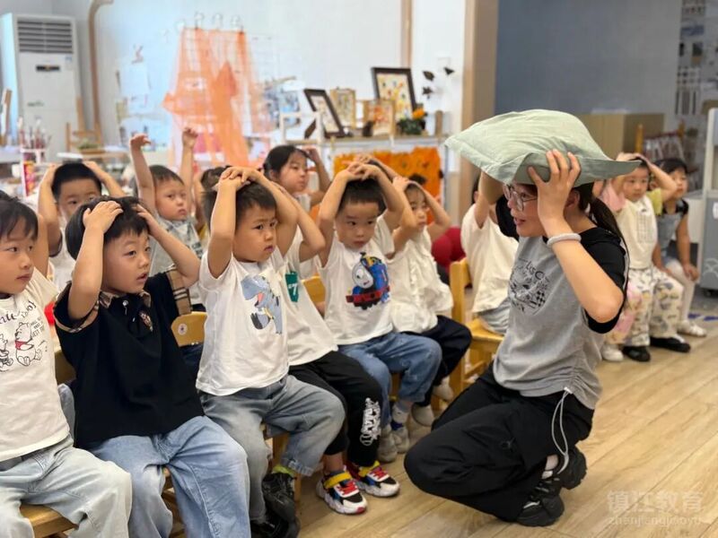 镇江市中山路中心幼儿园中建园区组织全体师生开展地震应急疏散演习。急促的警报声在园内响起,孩子们在老师引导下,迅速拿起身边小枕头、软垫护住头部;待“强震”暂歇,又在老师带领下,保持弯腰低身、护头姿势,沿预定路线快速有序地从各活动室撤离至室外安全地带。