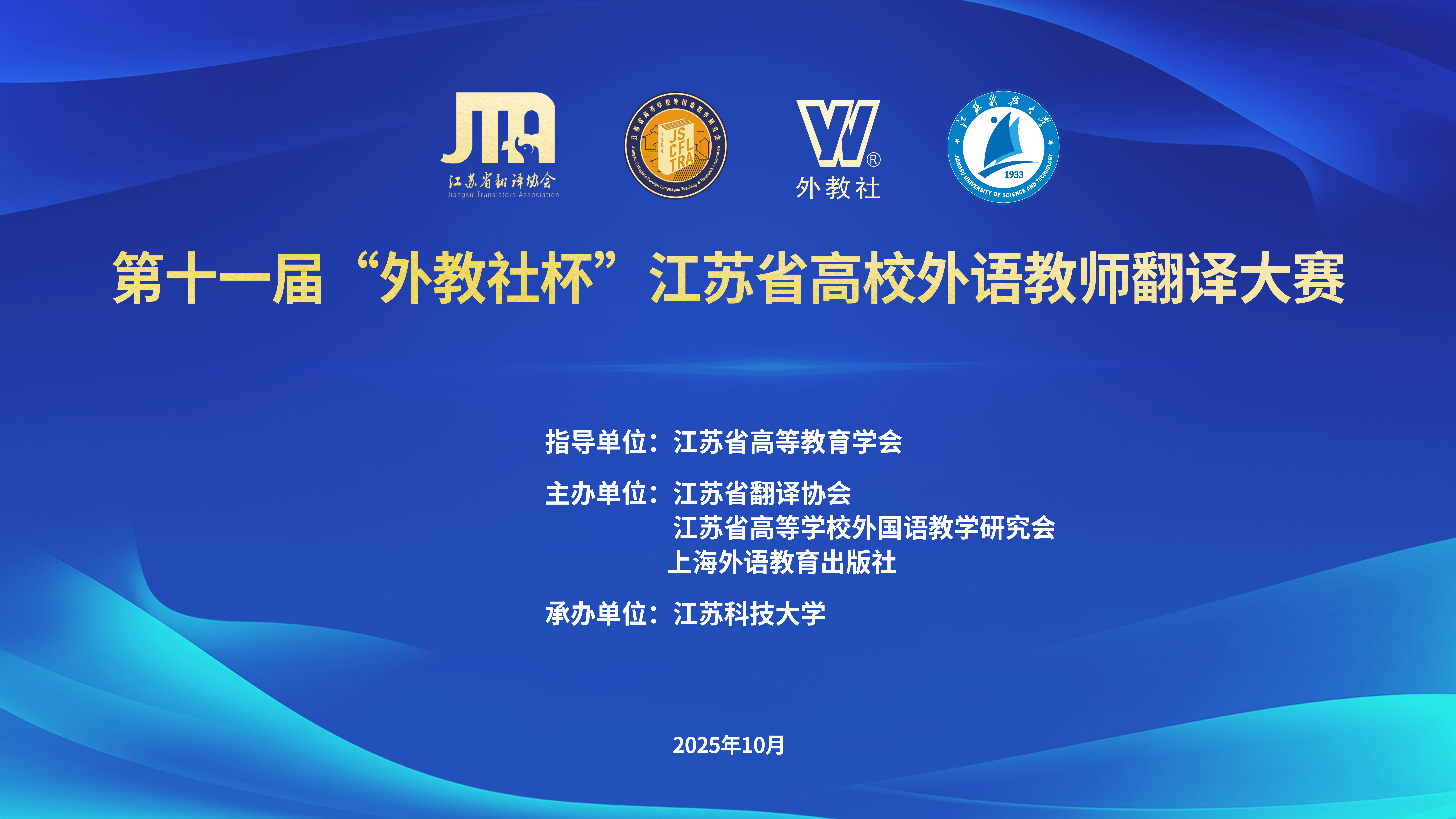 第十一届“外教社杯”江苏省高校外语教师翻译大赛评审会于10月12日在江苏科技大学成功举办。本次大赛由江苏省高等教育学会指导,江苏省翻译协会、江苏省高等学校外国语教学研究会和上海外语教育出版社共同主办,江苏科技大学承办。江苏科技大学党委常委、副校长潘锦全教授,大赛总评委苏州大学外国语学院院长孟祥春教授,江苏省翻译协会常务副秘书长、南京师范大学外国语学院许诗焱教授,上海外语教育出版社江苏中心主任黄新炎编审,以及江苏省内十余所高校的院长和知名教授组成的评委团出席本次评审会。