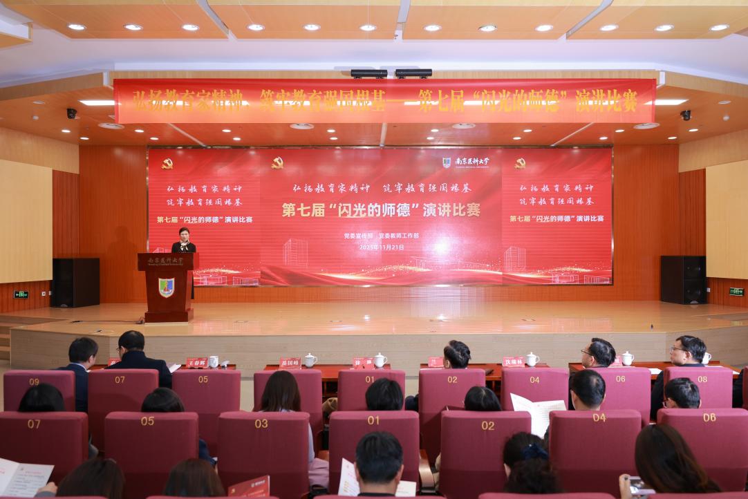 11月21日,南京医科大学第七届“闪光的师德”演讲比赛在江宁校区至诚楼报告厅举行。与蒋艳丽老师一样,13位来自学校和附属医院的临床、教学、科研、管理岗位一线的教师、医生、护士、辅导员同台竞技。他们围绕“弘扬教育家精神,筑牢教育强国根基”的主题,立足教职岗位,讲述了身边育人榜样在教学科研工作中如何用心、用情、用爱呵护学生成长的事迹,致敬时代“大先生”;也有的结合自己在育人岗位的成长经历,畅谈对师德内涵的深刻感悟,抒发对医学教育事业的无限热爱。
