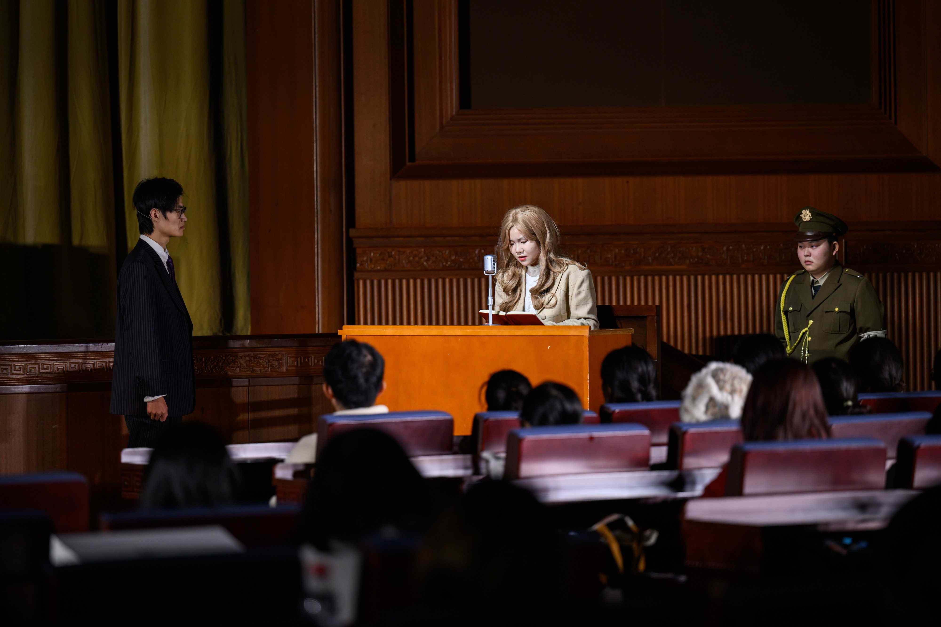舞台上,这群年轻人大多没有表演经验,却有着学校专业赋予的严谨与青年独有的赤诚。“我们没有受过表演训练,但我们有对历史的敬畏,和对法治的信仰。”饰演哈瑞魏特琳的法学院本科生肖锐雯这样说。这份表演的“素人”状态,恰成了连接历史与当下的独特通道。当年轻的面庞因激烈的庭辩而涨红,因出示触目惊心的证据而哽咽,观众看到的不仅是“演出”,更是一代青年对战争、人性与正义的严肃叩问。
