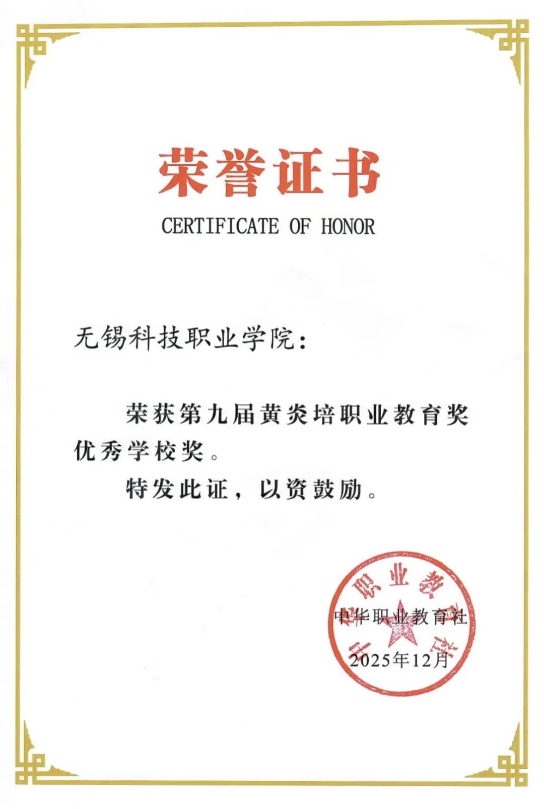 黄炎培职业教育奖是由中华职业教育社于2007年创立至今,经中共中央、国务院专项审核通过的职业教育领域唯一保留的全国性综合奖项,代表了我国职业教育界的最高荣誉。新时期以来,无锡科技职业学院把立德树人作为教育的根本任务,表彰了一大批在职业教育领域做出重要贡献的个人和单位,展示了职业教育战线先进典型的精神风貌和职业教育工作者取得的丰硕成果,成为职教领域具有高度公信力和影响力的品牌奖项,在推进职教改革、激发办学活力、凝聚奋进力量等方面发挥了重要作用。本届黄炎培职业教育奖从突出政治性、坚持与时俱进、注重引领性、纳入非遗四个方面,经省级推荐、专家初审、评审委员会复审、领导小组终审、网上公示等环节,共评选出“优秀学校奖”50个。无锡科技职业学院获得黄炎培职业教育奖“优秀学校奖”殊荣。