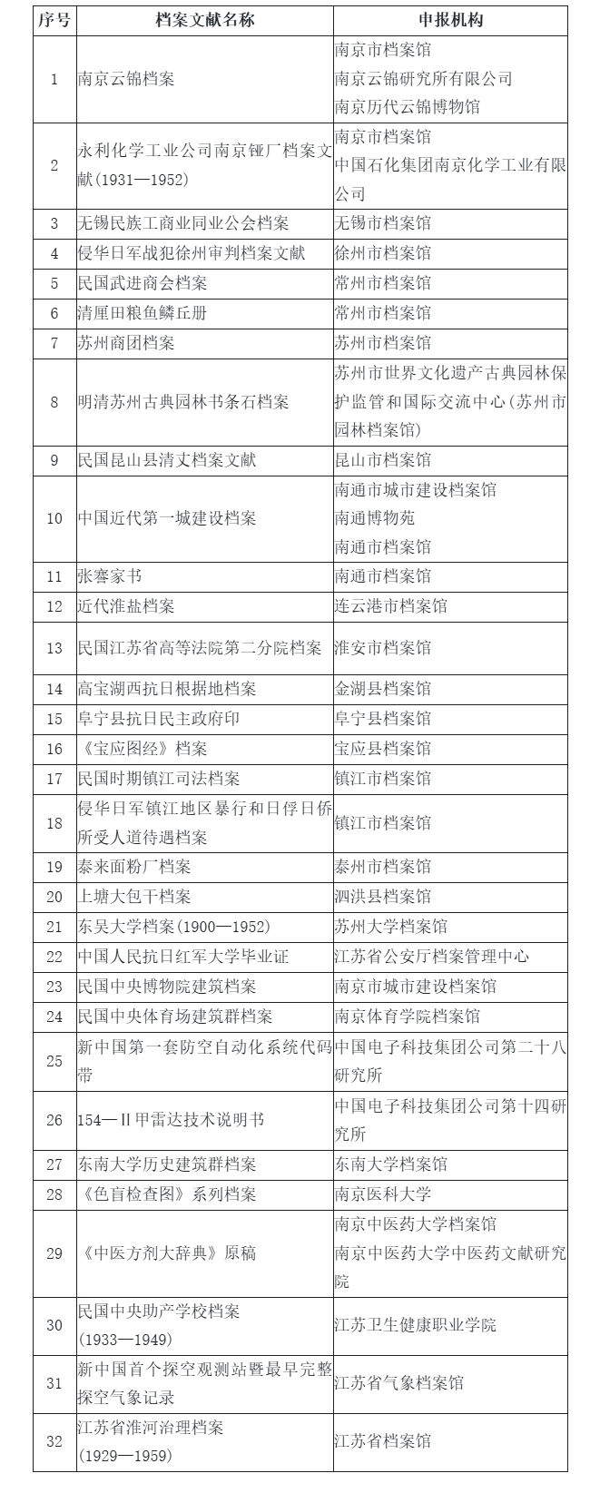 第一批入选《江苏档案文献遗产名录》的档案文献名单如下(排名不分先后):