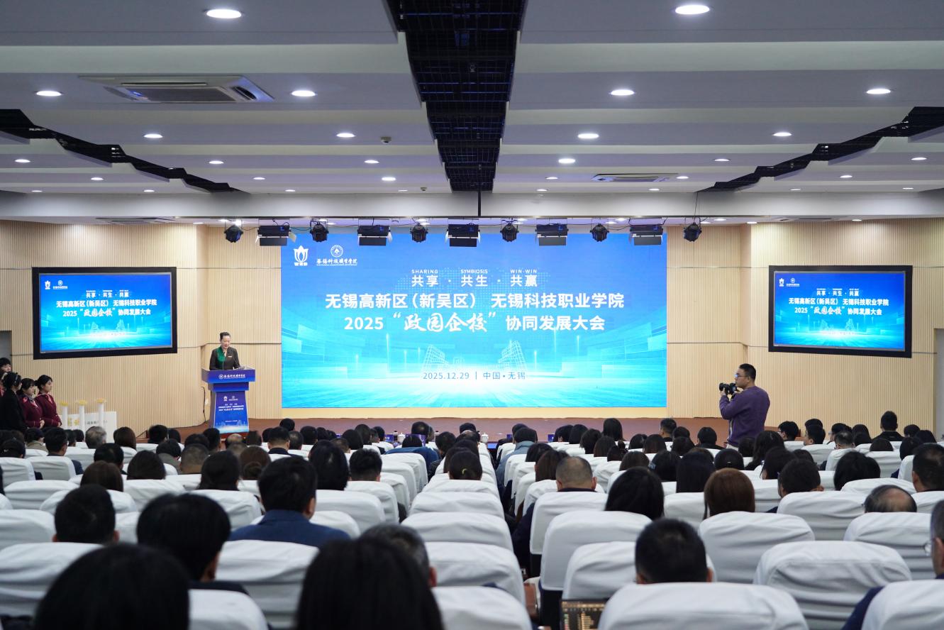 岁末情暖,共赴新程。12月29日上午,由无锡高新区(新吴区)与无锡科技职业学院共同主办的2025“政园企校”协同发展大会在学校博文楼报告厅隆重举行。大会以“共享·共生·共赢”为主题,汇聚了政府、16家重点园区、70余家企事业单位及行业协会的200余位代表,共同擘画四方联动、融合发展的崭新未来。无锡高新区党工委副书记、管委会副主任,新吴区委常委、副区长、学校理事会校企合作委员会主任顾国栋,无锡科技职业学院党委副书记、校长华裕良出席大会。