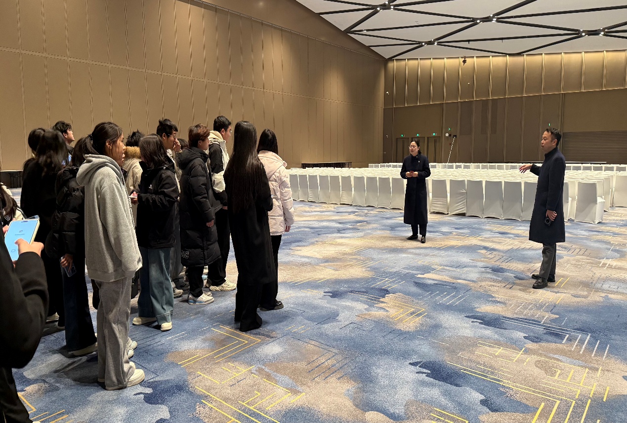活动当天,文化旅游学院会展专业师生跟随企业讲解员走进国际会议中心的无柱式宴会厅、智能中控室,实地观摩了大型会展活动的布展流程、智能设备运维细节,详细了解了会展项目从前期策划、招商推广到现场执行、后期复盘的全链条运作模式。