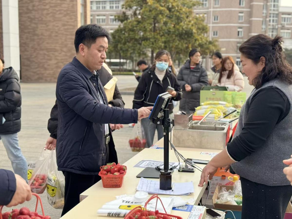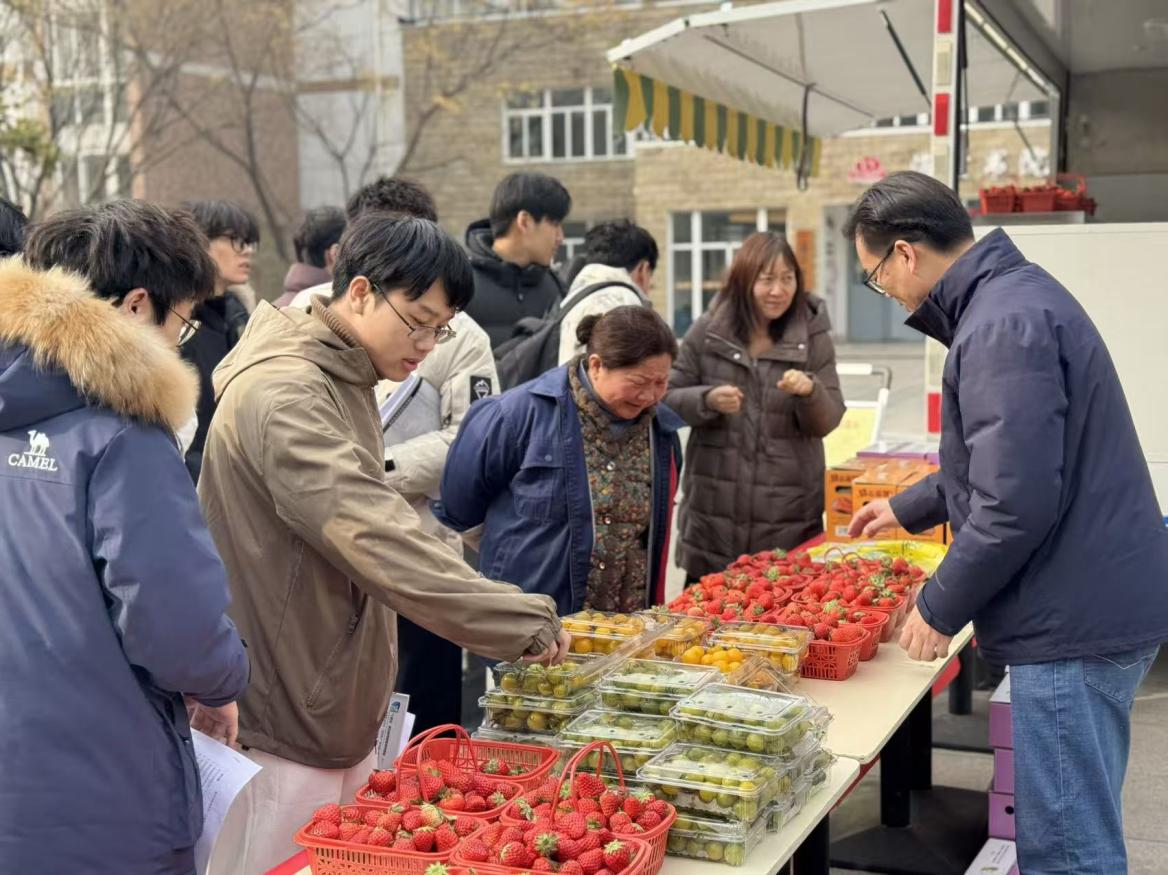 学校创新消费帮扶形式,携手省委驻淮阴区乡村振兴工作队将“乡村振兴助农直通车”开进校园,2026年1月成功举办马头镇名优农产品展销活动。豆皮、草莓、小番茄等特色农产品受到师生热烈欢迎,现场销售火爆,半天销售额即达两万余元。更重要的是,活动打通了从田间到校园的直供渠道,许多师生与农户建立了长期联系,实现了从“一次性购买”到“持续性联结”的转变。学校主要领导现场指导,并与地方党委负责人共商深化合作,将单纯的买卖关系升华为稳固的校地合作纽带,有效提升了马头镇农产品的知名度和市场竞争力。