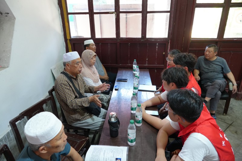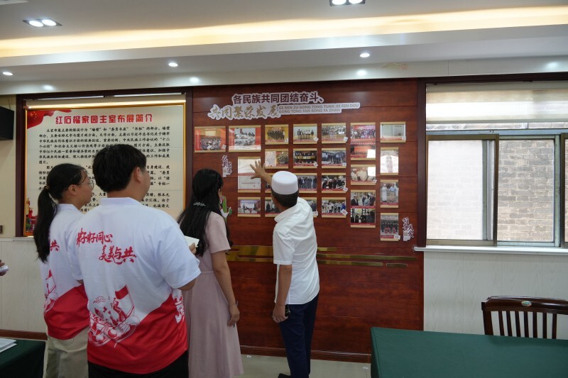 7月24日,团队在调研民族团结工作时,与全国民族团结进步模范个人樊维明展开深入交流,期间通过他展示的墙上老照片,真切感受到了淮安各族群众同心团结的温暖历程。照片里,1956年民族代表与中央领导的会面场景,清晰定格了运河畔各族群众共筑家园的初心;“红石榴家园”活动室陈列的影像更具生活气息——兰州拉面大赛中,回汉师傅切磋技艺的画面满是互学互鉴的暖意,青海撒拉族经营者与汉族员工共包中秋月饼的场景格外动人。“现在他们不仅是生意伙伴,更是常串门的街坊。”樊维明的话让志愿者印象深刻,大家深切体会到,这种“你中有我、我中有你”的日常,正是民族团结最扎实的体现。