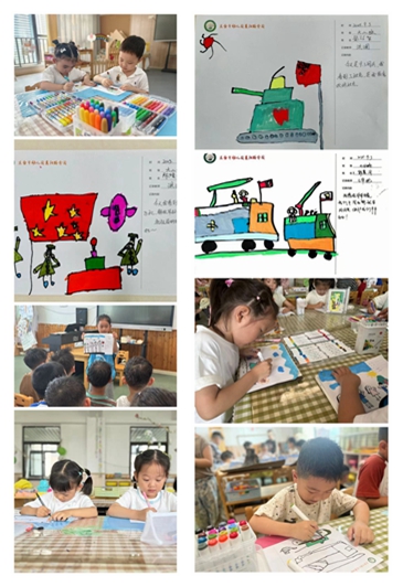 活动中,多元实践环节让爱国情怀落地生根。孩子们或挥动画笔,以稚嫩笔触勾勒受阅方阵、主战坦克与战机,绘出心中强军梦;或以画、剪、折、贴创作“阅兵长卷”,传递对中华精神的认同;或化身“小小战士”参与野战游戏,在协作运动中感悟历史、锤炼意志;或合作搭建“天安门”“坦克”等模型,上演童心版“阅兵”;或在红色绘本共读中铭记先辈奉献,在爱国旋律舞蹈中诉说对祖国的爱恋,一系列活动让爱国种子在体验与探索中持续生长。