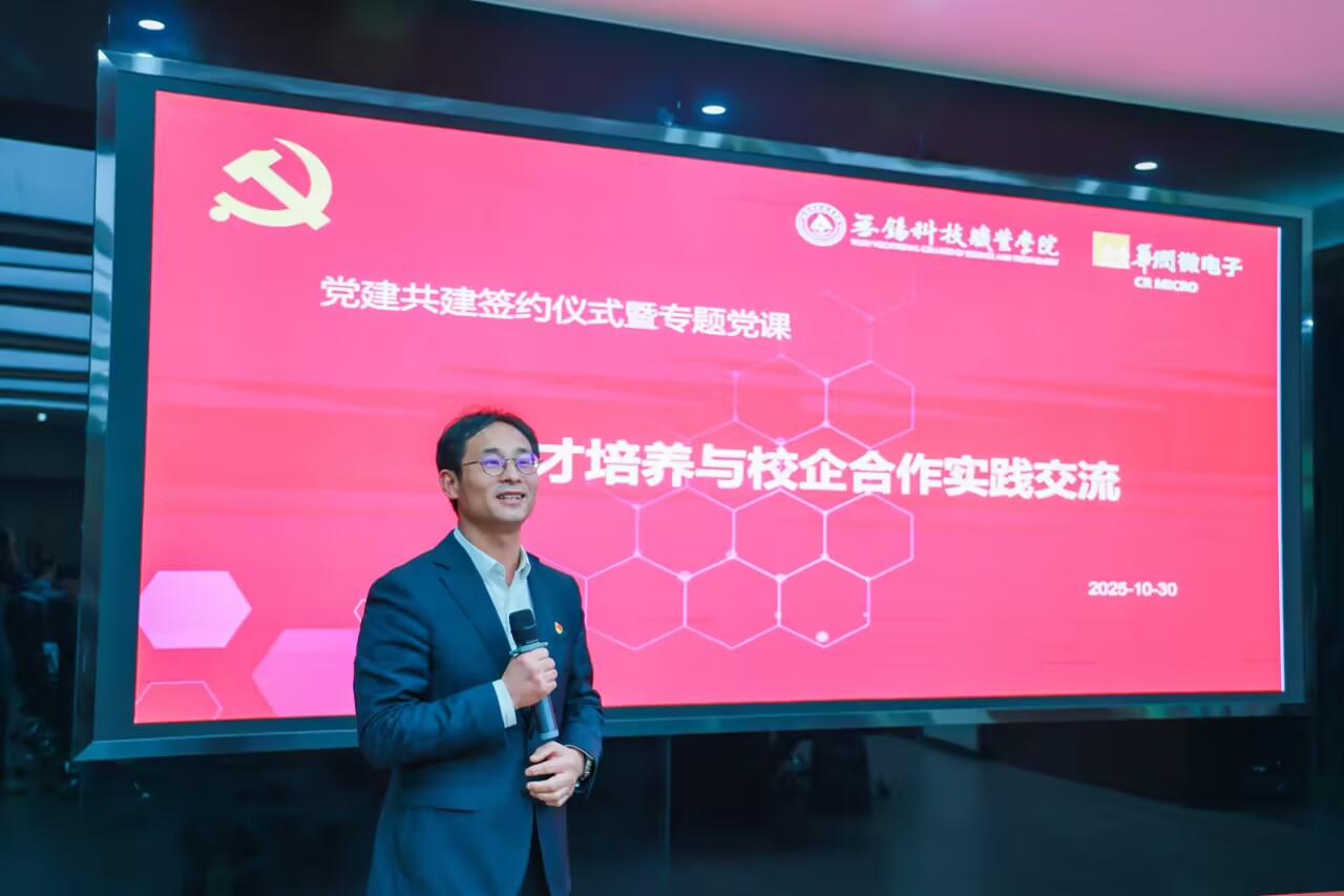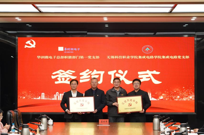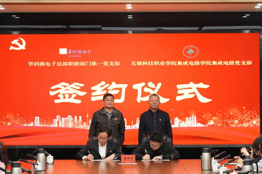 10月30日下午,无锡科技职业学院与华润微电子有限公司的党支部党建共建签约仪式暨专题党课活动在学校培训中心举行。华润微电子有限公司党委副书记、董事王小虎,华润微电子组织部部长、总部职能部门第一党支部书记曹玉文,无锡科技职业学院党委副书记、校长华裕良,无锡科技职业学院党委委员、组织部部长胡光明,集成电路学院党总支书记曹方建、院长李蕾蕾及双方党支部全体党员出席活动。
