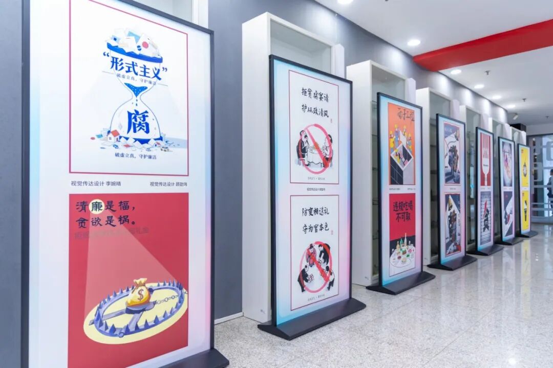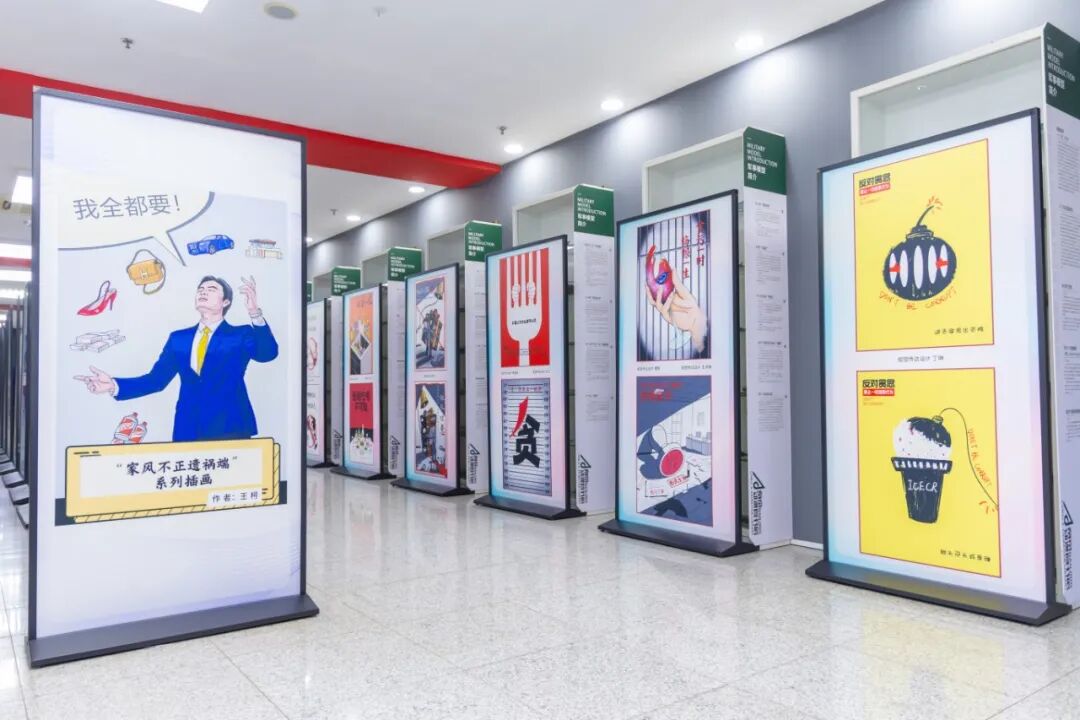 位于南京动漫科普馆“星火”馆的“廉洁文化作品展”也同步开放。展区内,师生创作的动态插画、3D打印文创产品、AI动态展示作品、廉洁主题微电影及IP设计等共计76件作品集中亮相,通过艺术形式生动地传播廉洁文化。