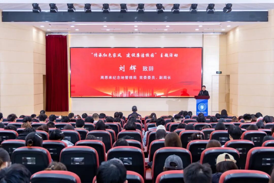 刘辉致辞。他认为,周恩来同志“过五关”的崇高风范和“鞠躬尽瘁、死而后已”的奉献精神,是新时代涵养廉洁家风、培育廉洁文化的宝贵财富。