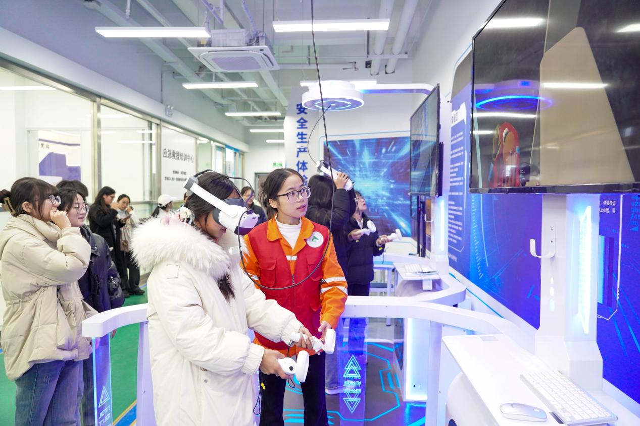 随后,师生移步学校安全教育基地,参与模拟灭火、VR 情景互动、消防水带连接、灭火器实操等沉浸式应急体验,在“做中学、学中练”,提升实战能力与风险应对素养。
