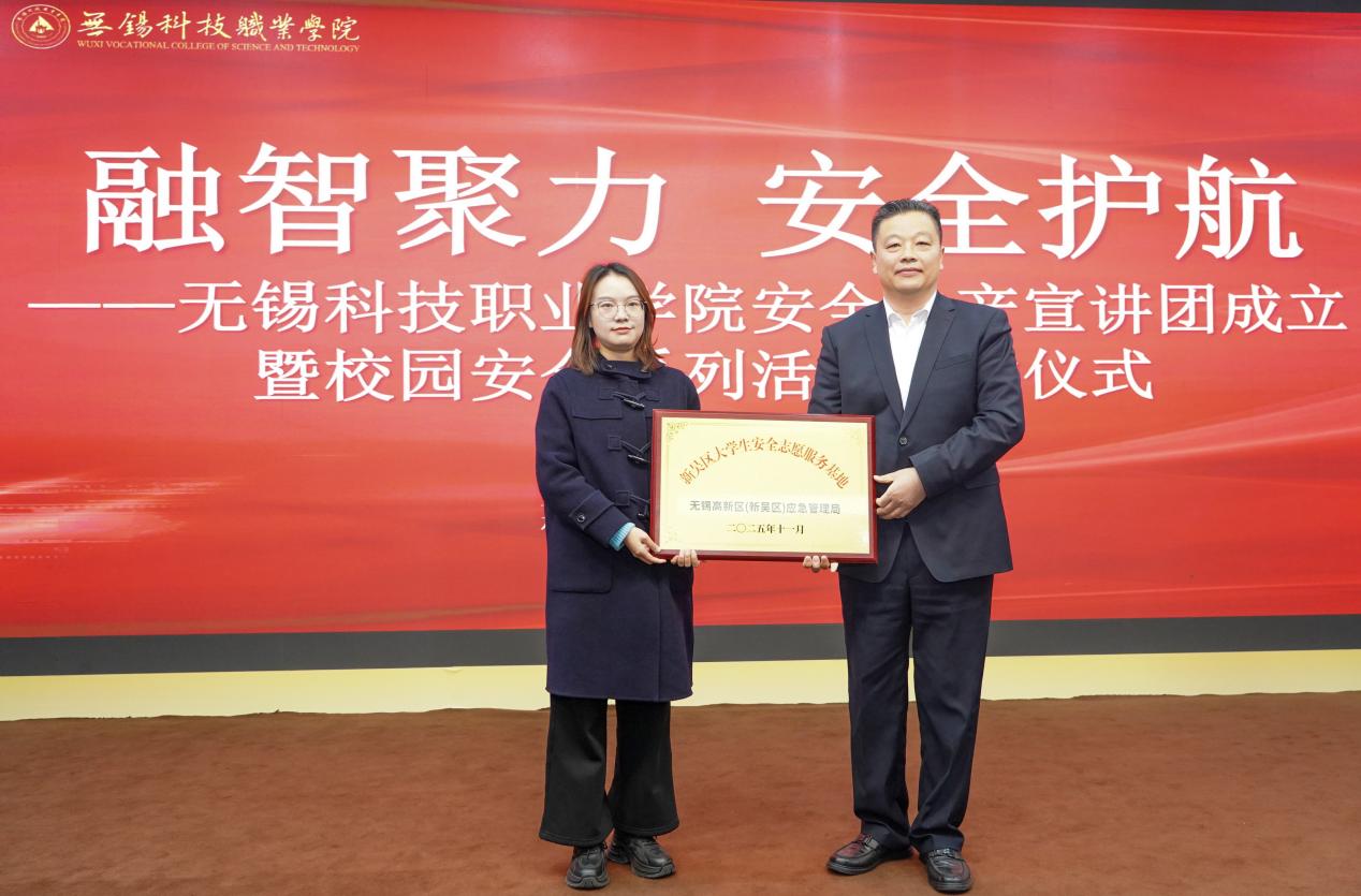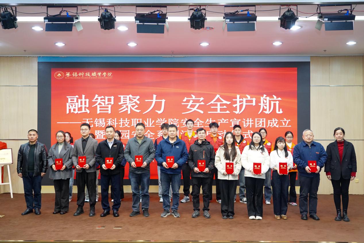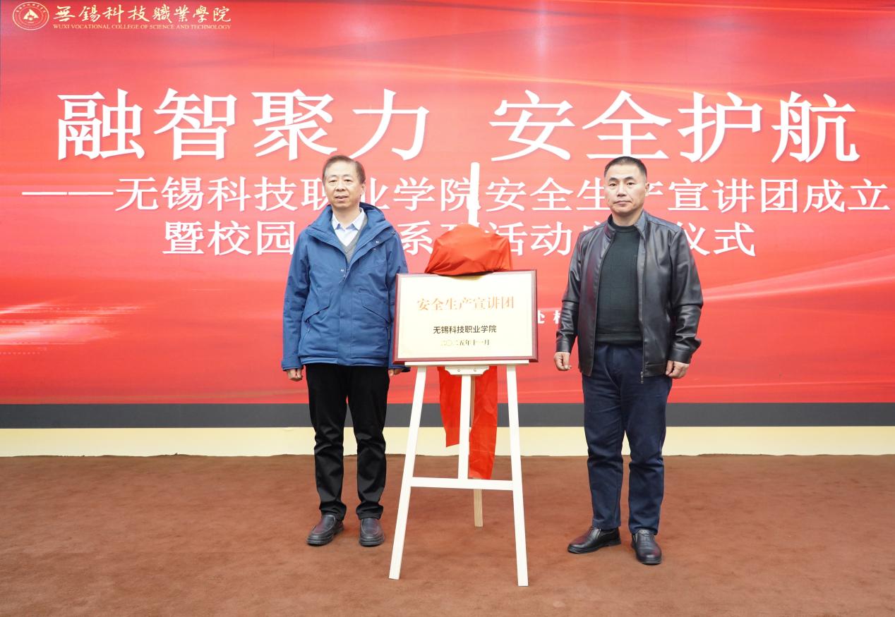 无锡科技职业学院保卫处处长徐海东与智能制造学院院长张国新共同为“无锡科技职业学院安全生产宣讲团”揭牌,标志着这支由专业师资与优秀学生组成的安全宣传队伍正式启航。