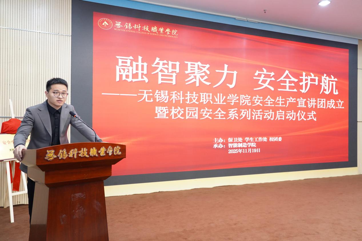 11 月 19 日下午,无锡科技职业学院“融智聚力 安全护航”安全生产宣讲团成立暨校园安全系列活动启动仪式在学校博文楼报告厅举行。无锡市新吴区应急管理局党委书记、副局长张凡明,无锡科技职业学院副校长王锡刚出席活动,学校保卫处、学生工作处、团委、智能制造学院相关负责人,各二级学院师生代表近 400 人参加活动。