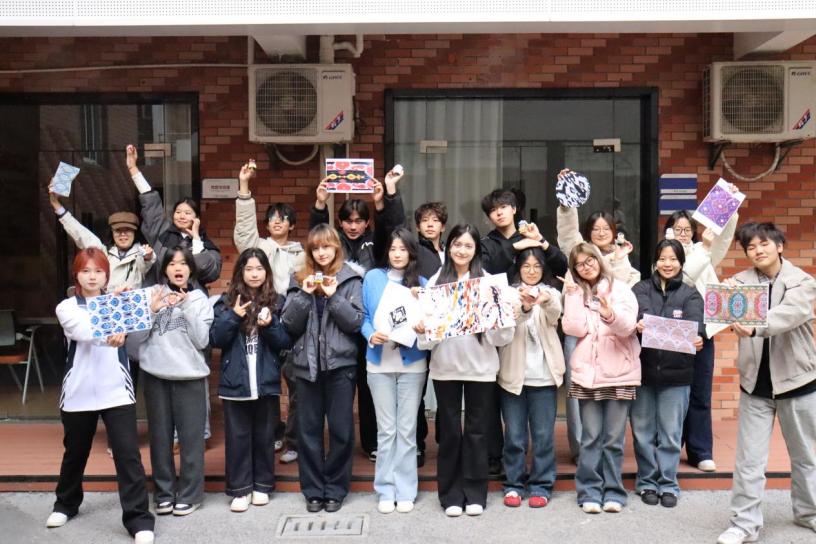 活动开始,来自新疆的学生祖力皮亚同学通过播放艾德莱斯绸制作过程的精美短片,为参与学生讲解艾德莱斯纹样来源、图案寓意以及色彩哲学。她解释道,绸缎上蜿蜒的流水纹源于喀什的绿洲,瑰丽的色块是对帕米尔高原落日的写意,那些巴旦木、乐器等抽象图案,更是维吾尔族人民对美好生活的全部寄寓。“它不只是布料,是穿在身上的史书。”