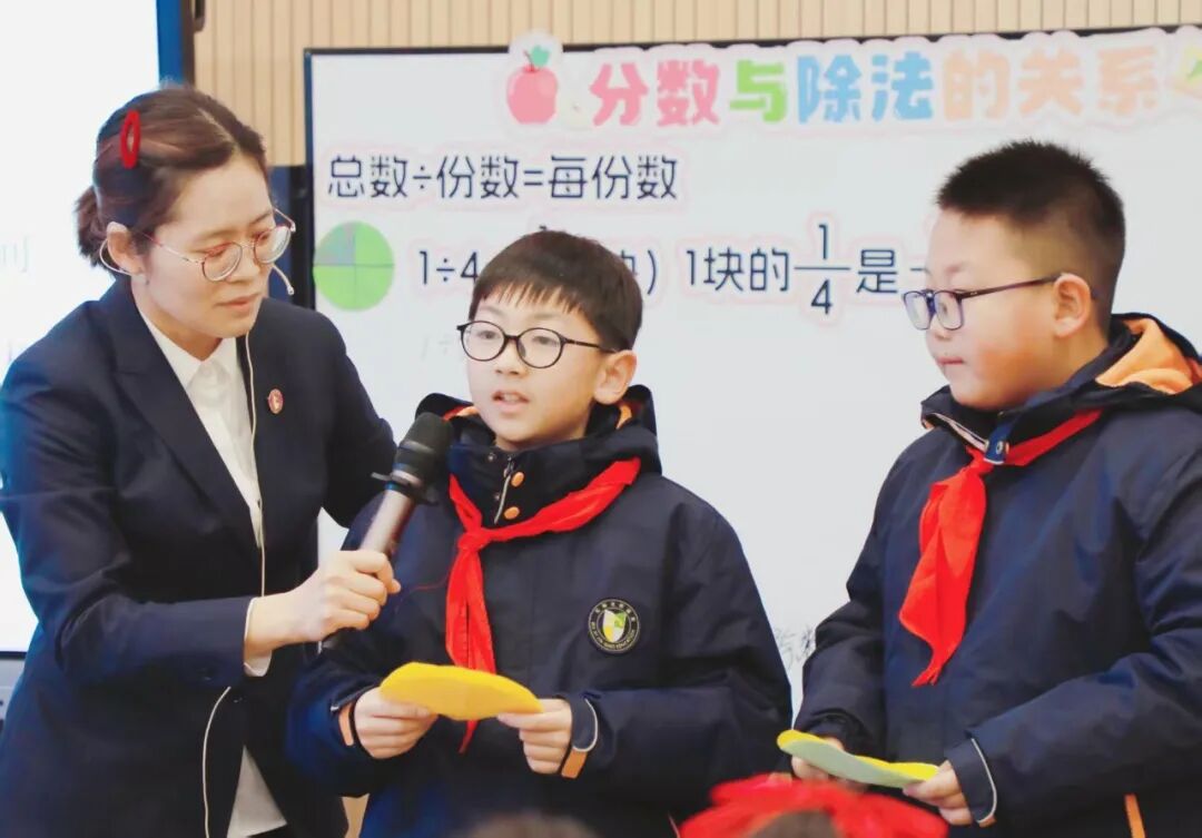 金桥外国语学校赵倩老师带来《分数与除法》,从分饼实操入手,引领学生在折一折、算一算的探究中,揭开分数与除法的内在联系,让抽象知识在生活化场景中落地生根。