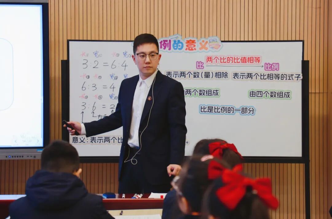 金桥外国语学校周川成老师执教《比例的意义》,以“小金人照片放大不变形”为引,引导学生历经“写比—求比值—组等式”的探究过程,明晰比例本质,辨析比与比例的关联,凸显数学应用价值。