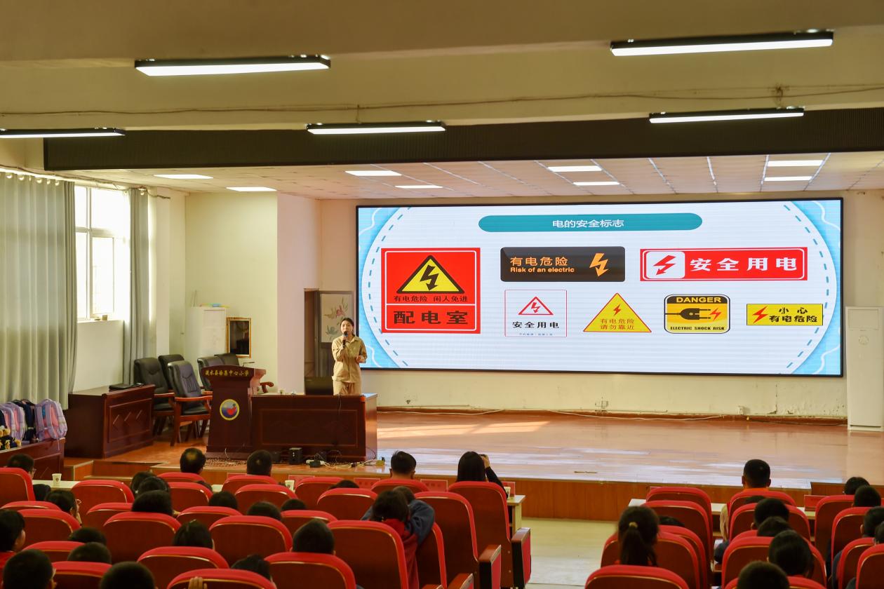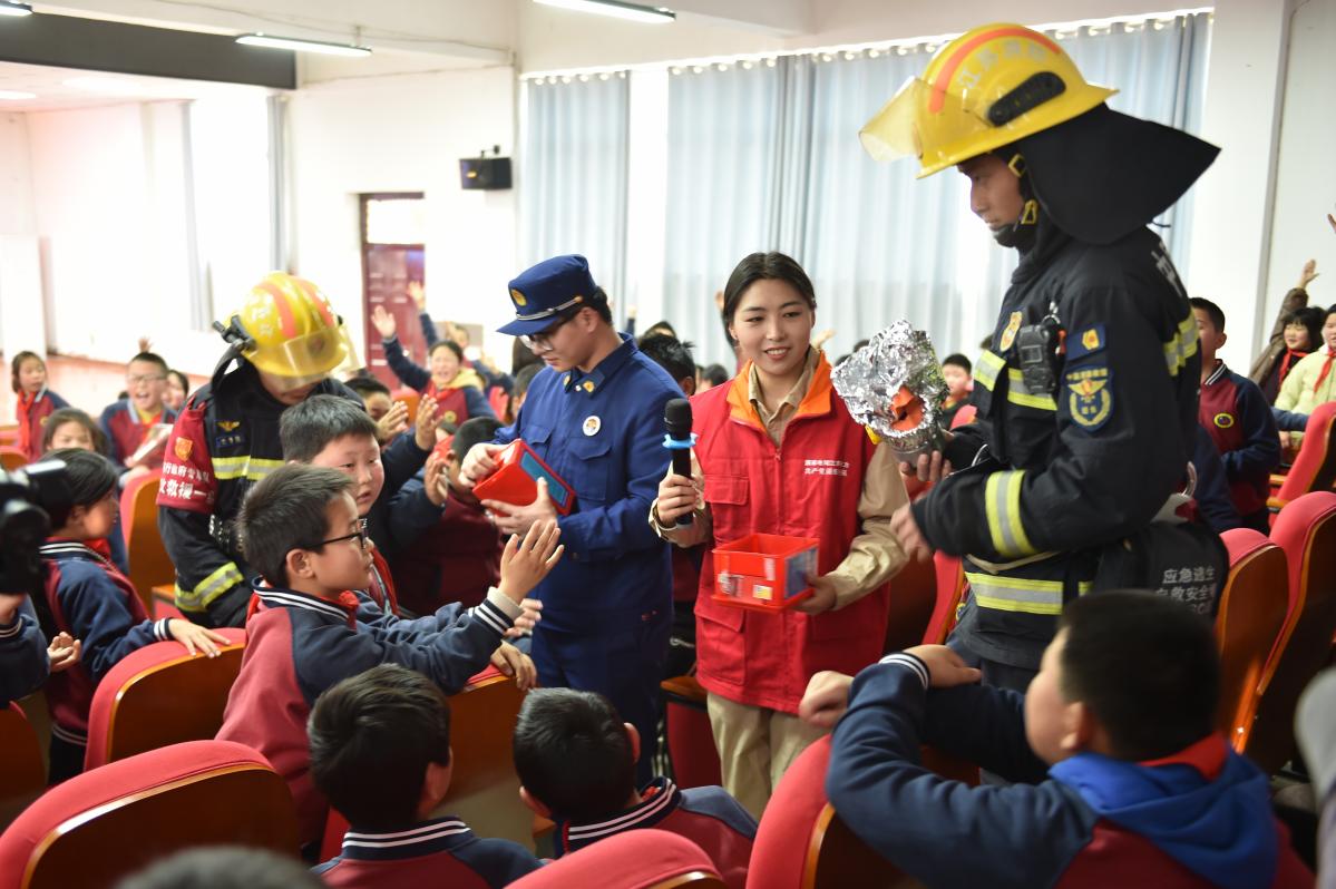 在资深心理专家为孩子们带来简短的互动课堂后,来自国网涟水县供电公司的电力安全辅导员走上讲台,用一段段真实的视频案例吸引了全场目光。“同学们,你们知道为什么放风筝时要远离高压线吗?”随着画面的切换,风筝挂线、钓鱼触线、湿手拔插头等常见却又极易被忽视的危险场景一一呈现,孩子们时而屏息凝神,时而发出惊叹。电力课堂的“有奖问答”环节将现场气氛推向高潮。孩子们争先恐后举手,稚嫩的声音中透着笃定。答对的同学不仅收获了掌声,还能赢得学习用品套装。随后,消防队员围绕春季火灾特点,特别是电器引发火灾的案例进行了知识科普。
