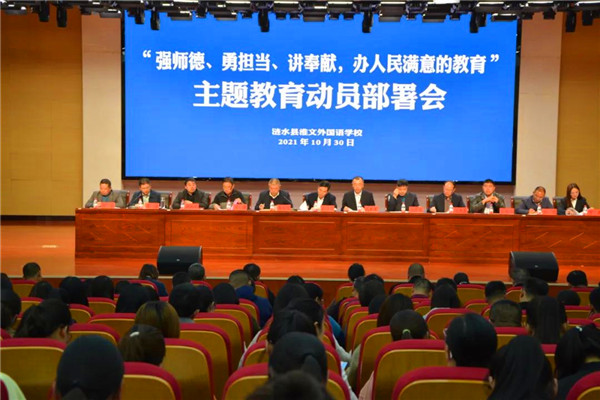 为贯彻落实县教育体育局《关于开展“强师德、勇担当、讲奉献,办人民满意的教育”主题教育活动的实施意见》和汤胜国局长讲话精神,进一步加强我校师德师风建设,提高教师职业道德修养,强化教师文明从教、规范执教、廉洁施教的职业意识,办好人民满意的教育,10月30日下午,淮文外国语学校召开“强师德、勇担当、讲奉献,办人民满意的教育”主题教育动员部署会。涟水县教育体育局钱承军主任、淮文外国语学校全体教师参加会议。会议由李文忠副校长主持。